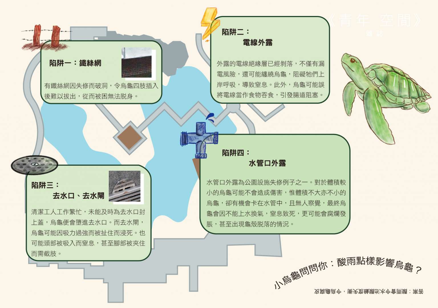 水管口外露為公園設施失修例子之一。對於體積較小的烏龜可能不會造成傷害,惟體積不大亦不小的烏龜,卻有機會卡在水管中,且無人察覺,最終烏龜會因不能上水換氣,窒息致死,更可能會腐爛發脹,甚至出現龜殼脫落的情況。