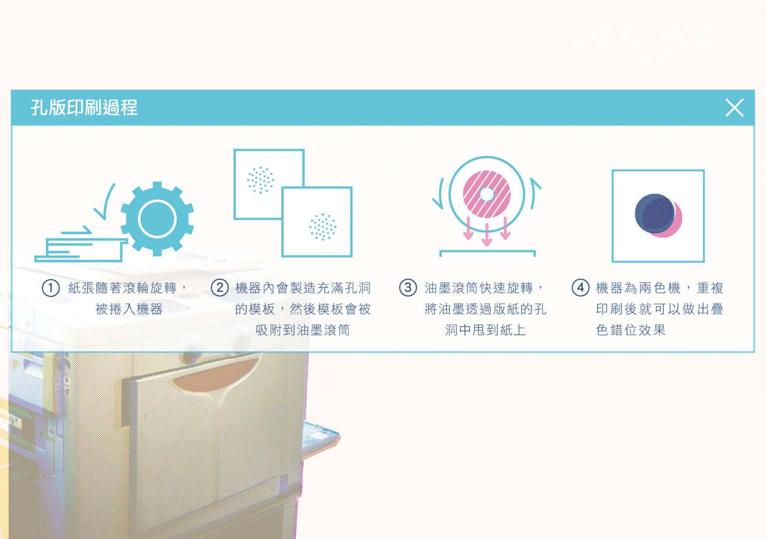 孔版印刷(Risography)屬單色疊色的印刷方法,透過網孔滲透油墨轉印圖案進行,色彩較一般印刷更鮮艷明亮,是小誌其中一種印刷方法,由於印刷作品相對數碼複印粗糙而帶有獨特的瑕疵,使每件作品都獨一無二。